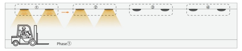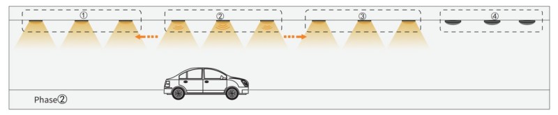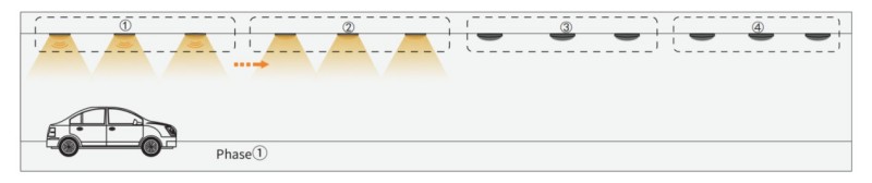 2. Wanneer de auto doorgaat naar groep2, activeert de Group2 -sensor de volgende Group1 en Group3. De andere lichten zijn nog steeds uit.