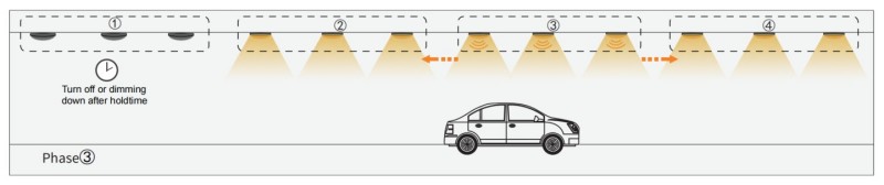 1. Wanneer de Group1 -sensor elke beweging zoals auto doorloopt, wordt de volgende groep2 geactiveerd, dus groep 1 en groep2 gaan aan, maar anderen zijn nog steeds uitgeschakeld. Omdat drie sensoren en drie lichten in 1 groep werden geprogrammeerd, zullen de in totaal 6 lichten van deze twee groepen tegelijkertijd worden ingeschakeld.
