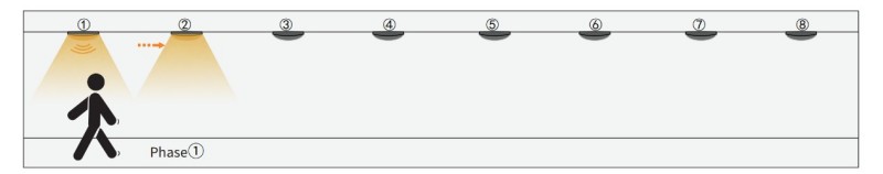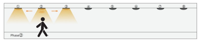 2. Wanneer mensen door groep2 gaan, zal de sensor actief zijn in zijn aangrenzende groepen1 en Group3. De rustverlichting is echter nog steeds uitgeschakeld.