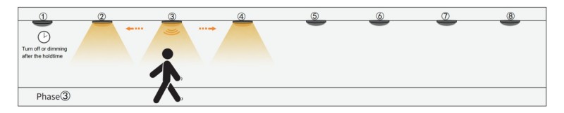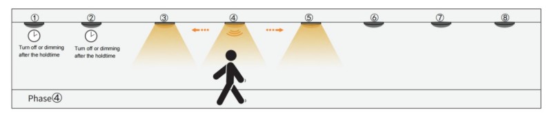 3. Wanneer mensen door groep 3 gaan, zal de Group 3 -sensor naburig in zijn Group2 en Group4. De andere groepen blijven weg. Vervolgens wordt groep 1 uitgeschakeld of duikt, omdat de bewegingssensor na lange tijd geen RF -signaal ontvangt of detecteert.