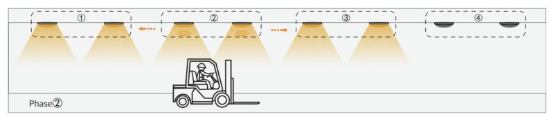 3. Wanneer het object over Group3, activeert de Group3 -sensor de aangrenzende groep2 en groep4. De andere groepslichten zijn nog steeds uitgeschakeld. De groep1 wordt uitgeschakeld of duikt af, omdat de bewegingssensor na lange tijd geen RF -signaal ontvangt of detecteert.
